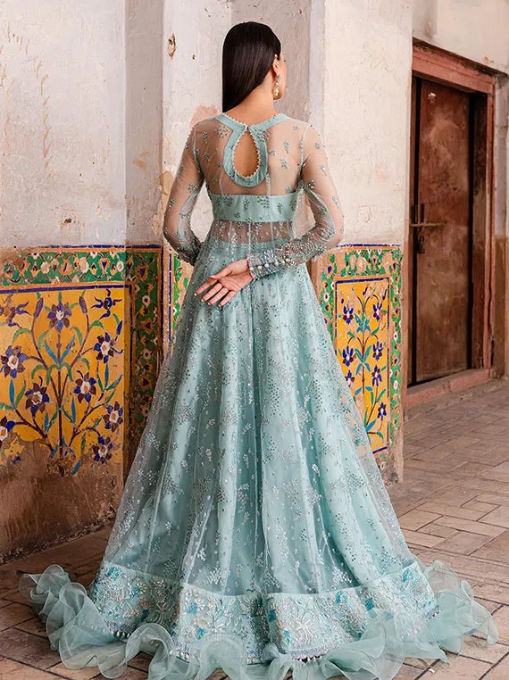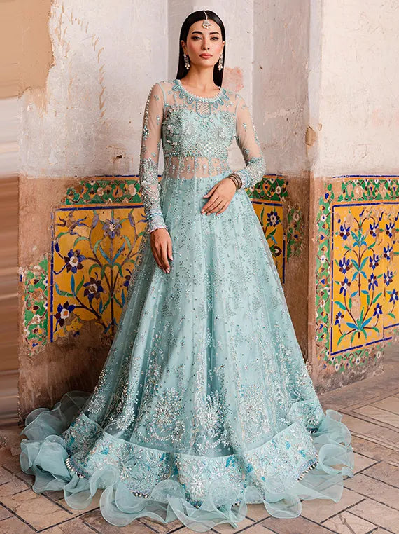 Wrapped Beautifully In This Elegant Silhouette ‘Myna’, A Contem- porary Dress Of Periwinkle Blue Tone Crafted To Perfection On Net Fabric Base. It Is Filled With 3d Embellishments, Pearls, Crystals And Modern Embroideries. To Complete The Look It Is Paired With Embroidered Dupatta With Baby Lilac Accents, Rawsilk Flared Lehenga And Undershirt, Giving It A Splendid Formal Occasion Look.